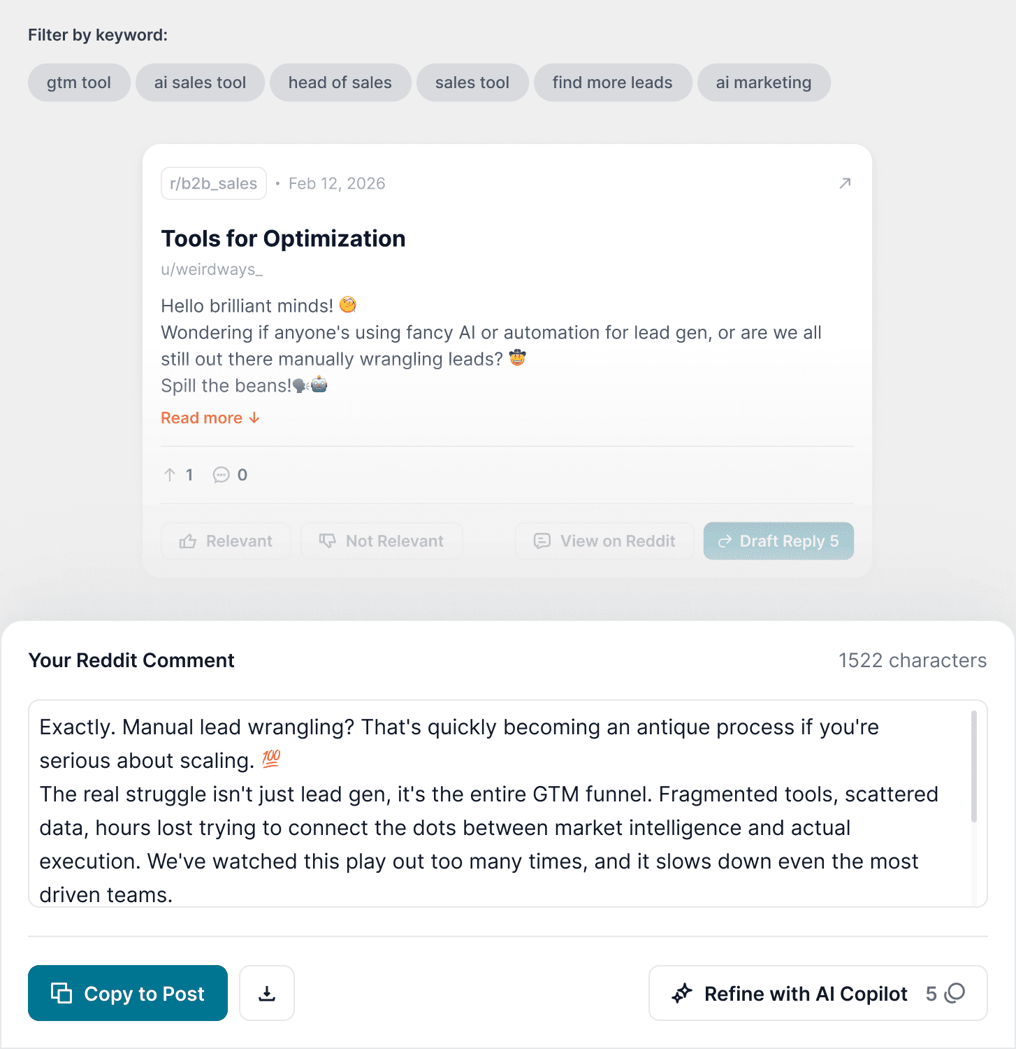 Track competitors, keywords, and brand mentions across LinkedIn, Reddit, X, and niche forums in one unified dashboard.